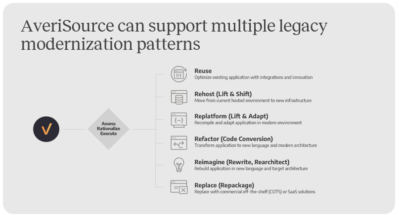 A Reimagine strategy provides the ability to move away from the existing monolithic legacy codebase. The AveriSource Platform delivers a unique Reimagine approach that enables developers and analysts to accelerate application analysis, business rules extraction, and code transformation, targeting on premises environments, virtual, or cloud platform, including containers, microservices, APIs, or the public cloud.